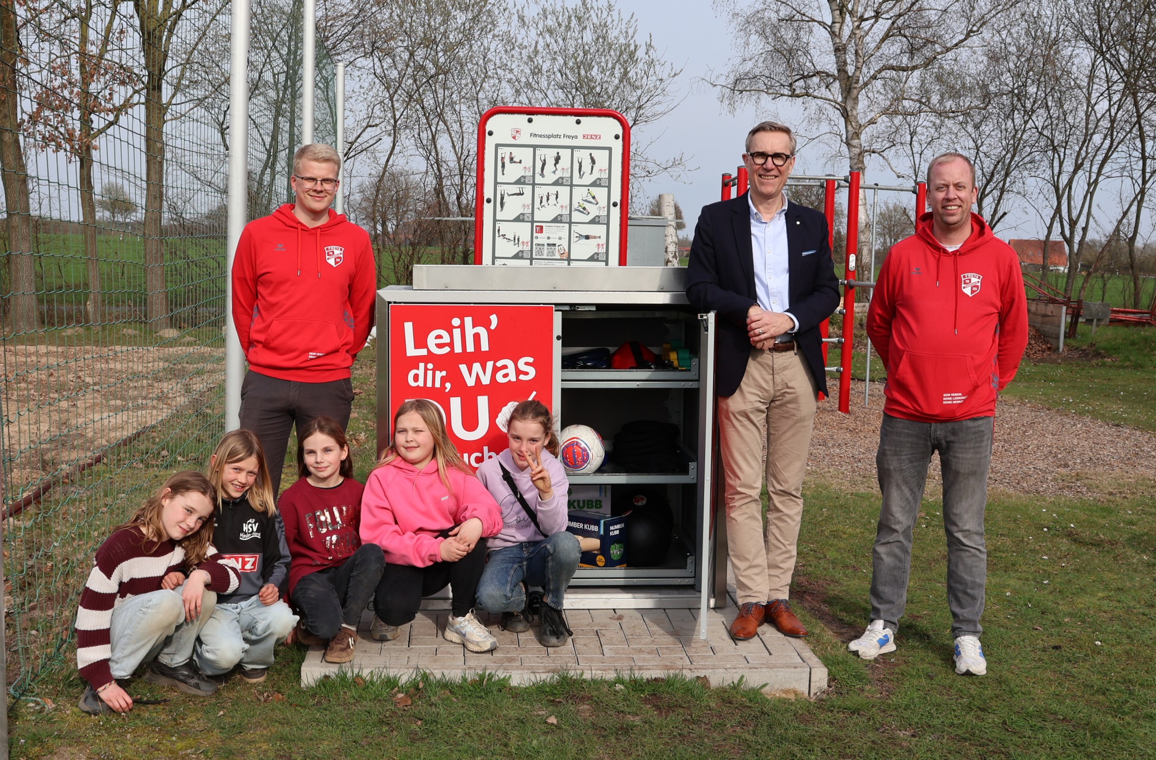 Neben Lennart Finke (l.), Pressewart vom TuS Freya, und Arne Wohl (r.), erster Vorsitzender vom Tus Freya, freuen sich auch Franziska, Mila, Melia, Louisa und Swea (v. l.) über die Sportbox. Mario Hoffmeister, Leiter des Zentralbereichs Kommunikation der Merkur Group, vertrat die Merkur Group bei der Eröffnungsfeier.