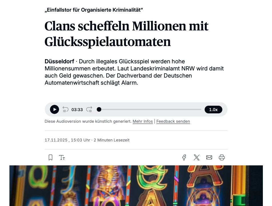 Christian Schwerdtfeger, Chefreporter der renommierten Rheinischen Post, hat am Montag die Reportage „Einfallstor für Organisierte Kriminalität – Clans scheffeln Millionen mit Glücksspielautomaten“ ins Blatt gehoben. Bereits im Vorspann macht der Autor deutlich: „Durch illegales Glücksspiel werden hohe Millionensummen erbeutet. Laut Landeskriminalamt NRW wird damit auch Geld gewaschen. Der Dachverband der Deutschen Automatenwirtschaft schlägt Alarm.“